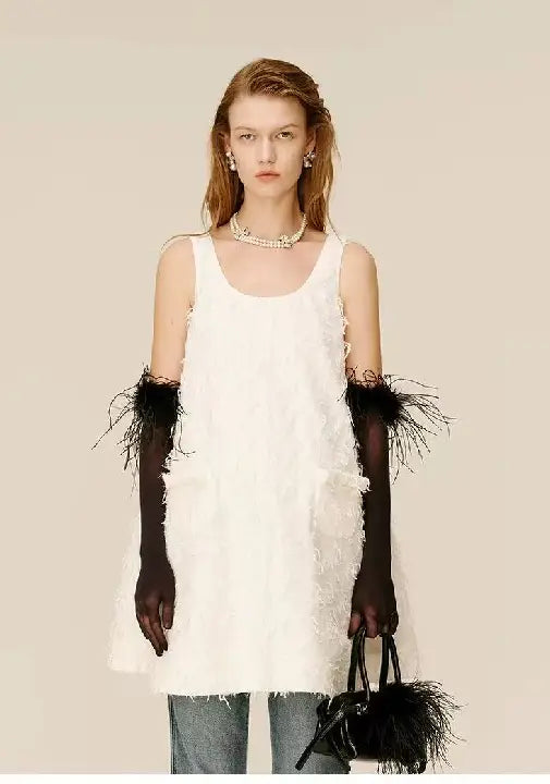 Glamorous sequins and exquisite feathers—a festive and celebratory outfit.